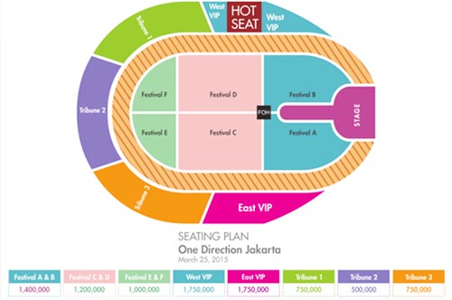 Menyambut euforia kegembiraan dari para fans One Direction, pihak promotor juga sudah merilis harga tiket konser one direction serta tempat duduk yang disediakan untuk konser di GBK nanti. Dari situs resmi konser One Direction Indonesia, berikut daftar harga tiket serta seating plan yang disediakan :